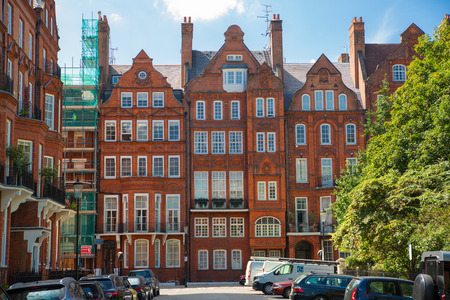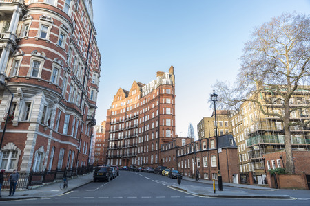 LONDON, UK - FEBRUARY 13, 2017: Red brick Victorian houses facades in Mount Street (borough of Westminster)