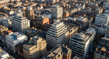 An aerial photograph capturing a dense urban district with a diverse mix of modern and traditional architecture. The scene is tightly packed with residential and commercial buildings, showcasing the vibrant and complex nature of city life.