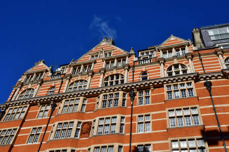 London, U.K, March 2019, view of the upper part of the exterior of a ex fire station building converted into a luxurious hotel restaurant.