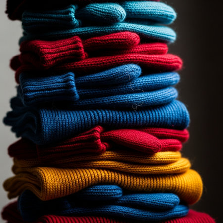 Multi colored woolen garments woven with intricate patterns for winter fashion generated by artificial intelligence