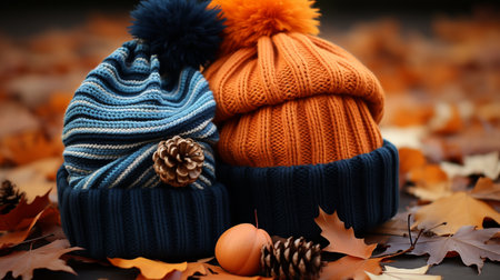 Warm and inviting knitted hats on neutral fabric surface soft winter aesthetic and calm design