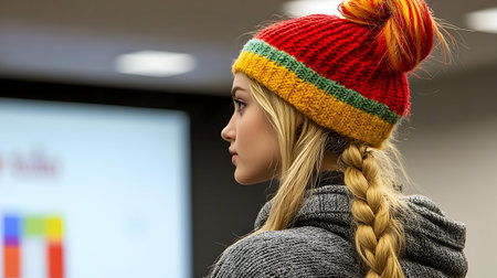 Young woman with long blonde braid wearing a colorful knit beanie, indoors, looking away. Image ideal for fashion or lifestyle publications.