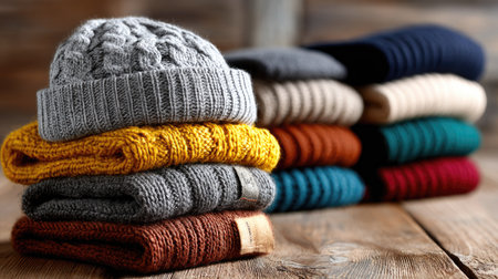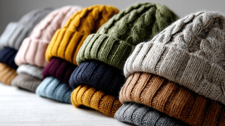 A vibrant collection of cozy knitted hats neatly stacked on a rustic wooden surface, showcasing various styles and colors ideal for winter looks.