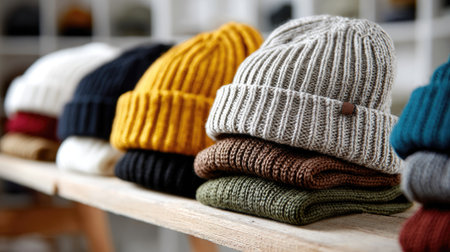 A beautifully arranged collection of cozy knitted beanies and hats sits on a wooden shelf, showcasing diverse colors and textures perfect for winter wear.