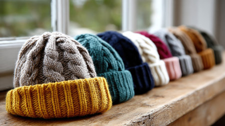 A beautiful collection of cozy knit beanies displayed on a rustic wooden surface, showcasing various colors and textures in soft natural lighting.