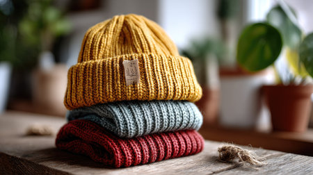 This image features a stack of three cozy beanies in warm colors, resting on a rustic wooden table with plants in a soft, inviting indoor setting.