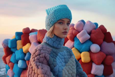 Woven knit hats in vibrant colors decorate the warm crowd generated by artificial intelligence