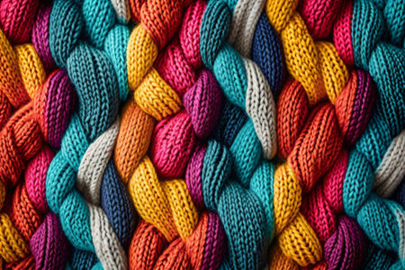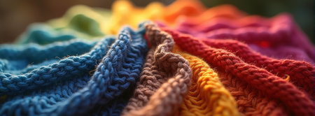 Cozy knitted texture featuring warm, colorful wool threads creating a vibrant pattern design.