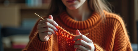 Young caucasian female knitting with wooden needles in cozy orange sweater.