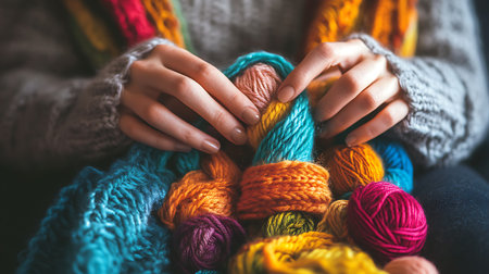 A cozy scene captures hands skillfully knitting vibrant yarns into beautiful patterns.