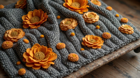 Cozy gray knitted blanket with decorative orange flowers on wooden surface. That the image is generated using AI.