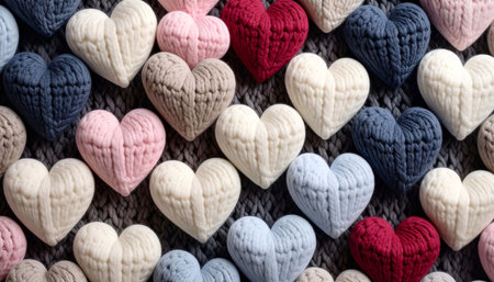A close-up shot of numerous small, knitted hearts in various pastel and deep colors arranged on a textured gray knit fabric background. The hearts show a detailed cable-knit pattern