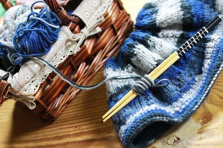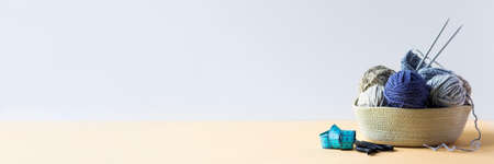 Gray and blue balls of thread in a beige basket with knitting needles for knitting warm clothes with scissors and a centimeter, knitting banner