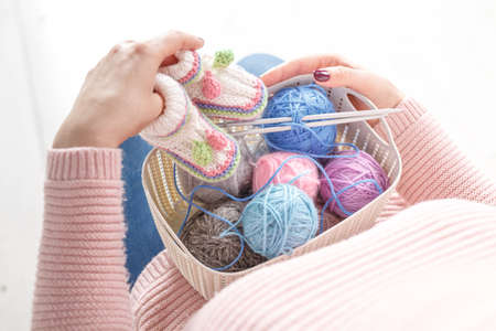 Cozy homely atmosphere. Female hobby knitting. Yarn in neutral shades in a basket