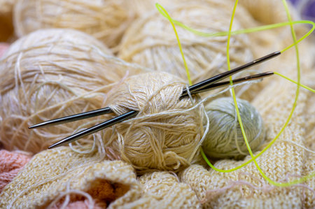 Threads for knitting closeup. Knitting as a hobby. Accessories for knitting.