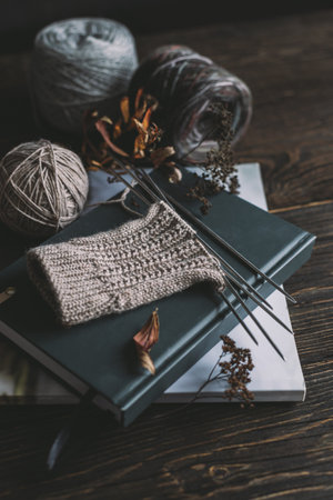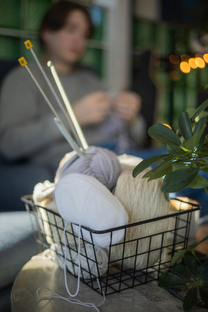 Cozy homely atmosphere. Female hobby knitting. Yarn in neutral colors.