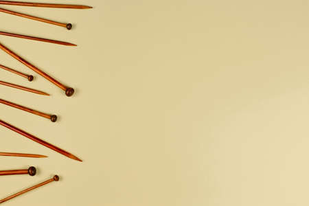 Wooden bamboo knitting needles on pastel background. Top view, copy space