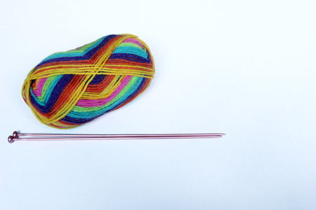Balls of colored knitting threads and knitting needles on a white background. Needlework and stress relief