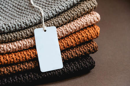 Stack of knitted material from threads of brown, orange, gray colors with an empty price tag on a brown background. Copy, empty space for text.