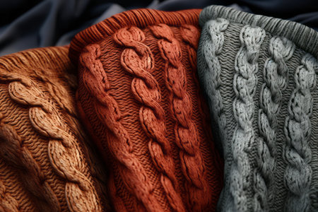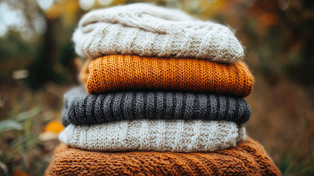 Soft knitted sweaters stacked in warm hues, creating a cozy fall or winter scene.