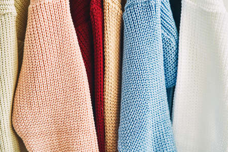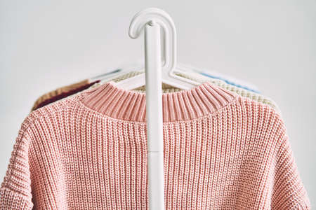 Pastel warm knitted clothes sweater hanging in the closet. Concept cozy autumn and winter wardrobe.