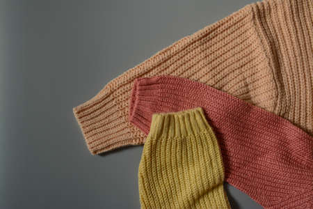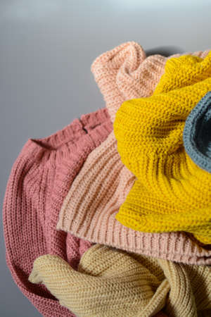 Winter warm woolen sweaters folded in a stack. Grey background copy space and empty place for your products. Cold time