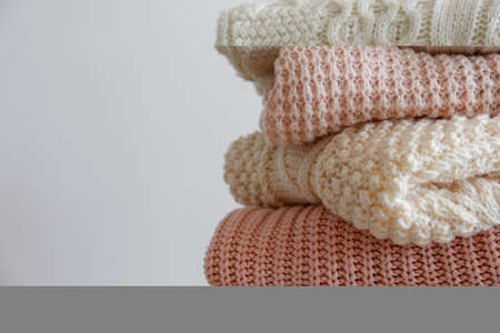 Bunch of knitted warm pastel color sweaters with different knitting patterns folded in stack, clearly visible texture. Stylish fall / winter season knitwear clothing. Close up, copy space for text.