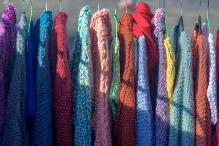 Colorful knitted female clothes on outdoor fashion exhibition, small business, outdoor street sale in conditions of lockdown