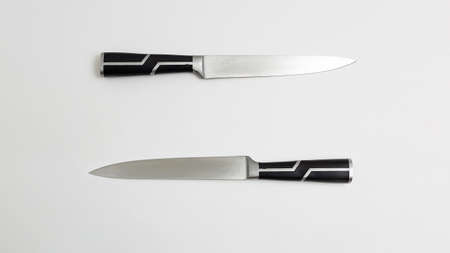 two sharp kitchen knives with black handles isolated on white background. top view on couple of knives with narrow shining metal blades. simple flat lay composition with copyspace. Space for text