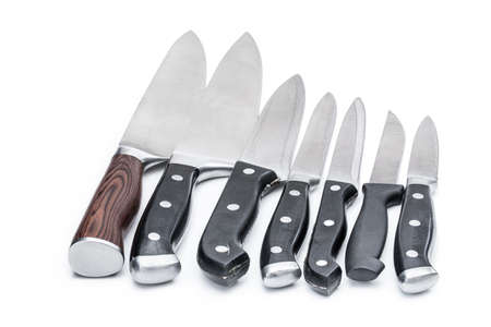 Set of different used and new kitchen knives isolated on white