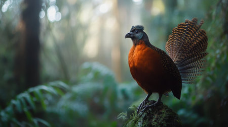 A magnificent bird stands proudly on a mossy rock, surrounded by vibrant green foliage in a tranquil forest, capturing the essence of wildlife beauty.