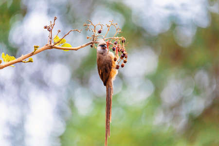 beautiful small bird Speckled mousebird, (Colius striatus) feeding on tree with berries. Ethiopia wildlife