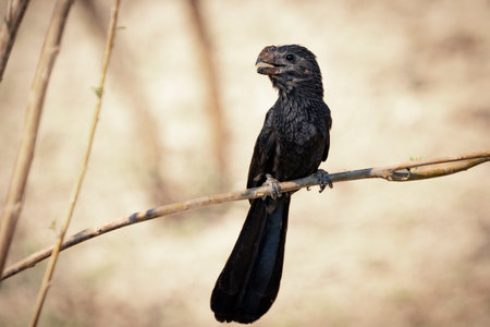 Smooth-billed ani on slim branch in the Pantanal Brazil.