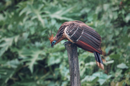 Hoatzin bird Opisthocomus hoazin perching on a tree stump in Manu National Park, Peru