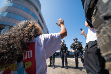 Los Angeles, USA – June 8, 2025: Protesters kneeling with hands up in front of police officers during a downtown demonstration against expanded ICE operations and in support of immigrant rights
