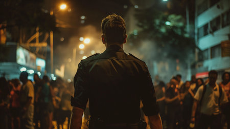 Korean police squad formation in uniform with Police logo, policemen maintain order and regulate traffic on incident and fire blaze site, crime scene, rescue operation in Busan city, South Korea