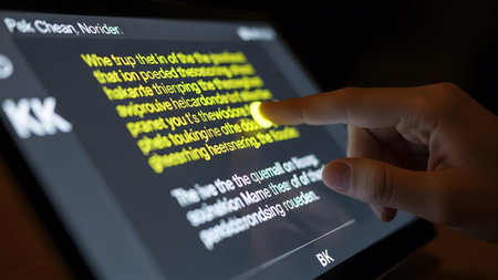A finger highlights yellow text on a dark digital tablet screen, showing an illuminated...