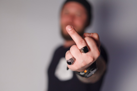 Portrait of a mad angry man showing fuck you gesture and looking at camera isolated over white background