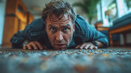 A man lying on the ground with his mouth open. This image can be used to depict exhaustion, surprise, or medical emergencies.