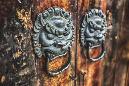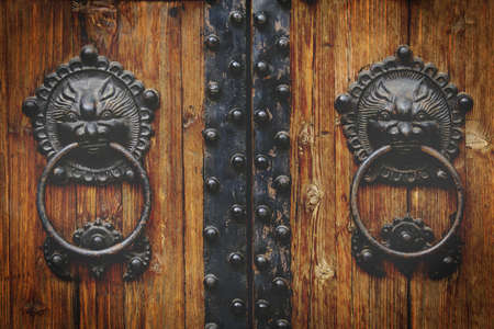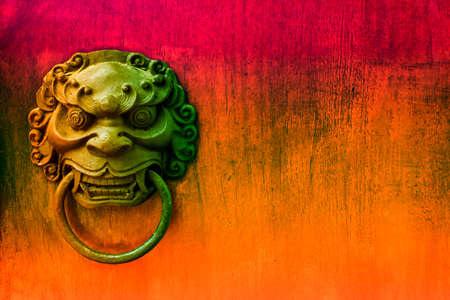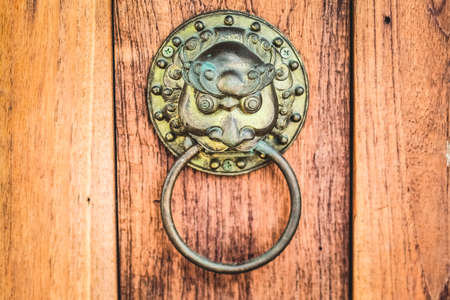 Old Chinese style lion ring bell on wooden door