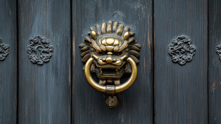 A striking bronze lion head door knocker adorns a beautifully aged wooden door, showcasing intricate artistry and rich textures that reflect tradition.