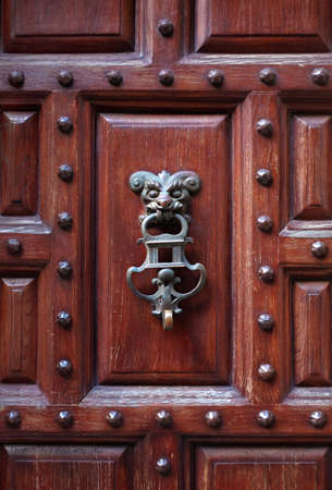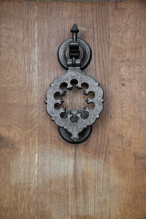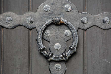 Detail of old metallic knocker or handle on the wooden door