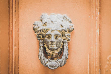 Old Metal Woman Head Knocker on Brown Wooden door in Mdina, Malta