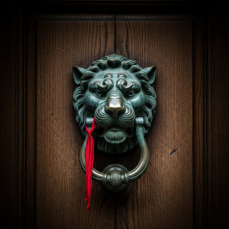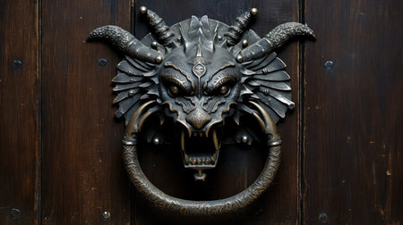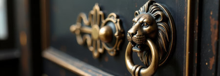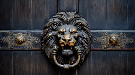 Close-up of a lion head door knocker, showcasing exquisite craftsmanship and adding a touch of luxury to dark wood furniture, with ample copy space for design or text