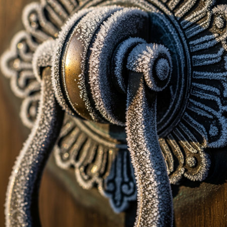 Detail of a metal door handle covered with frost and snow.