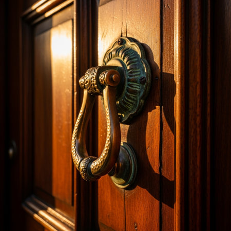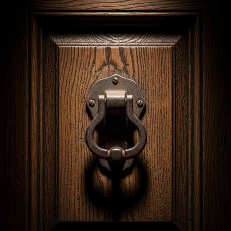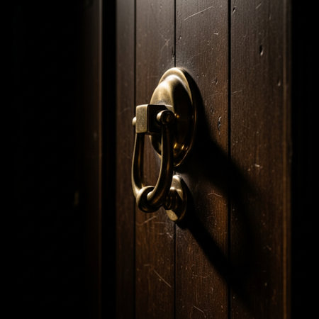 Editorial shot of a heavy, closed front door featuring an ornate brass knocker, rendered in a dramat
