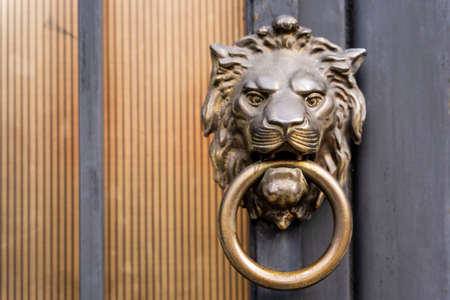 Antique brass door knocker in the shape of a lions head, door element with metal lion. The knocker in the form of lion on the old wooden door. Vintage door handle.