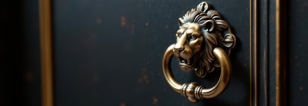 Close-up of an elegant golden lion head door knocker on a classic black door, offering ample copy space for design or text