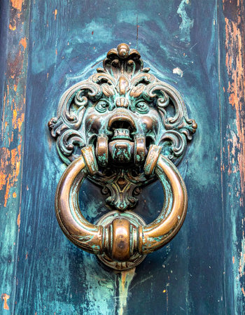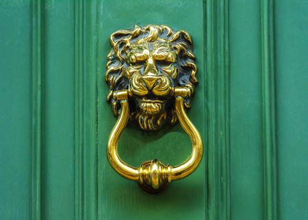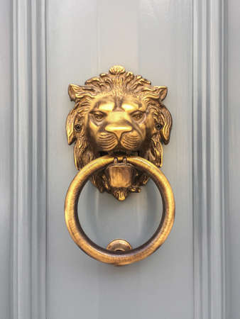 Door with brass knocker in the shape of a lion's head, beautiful entrance to the house, lion decor