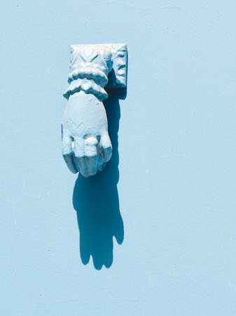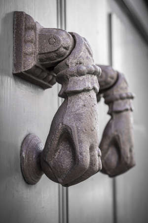 Antique old bronze door knocker in shape of a hand in ancient house